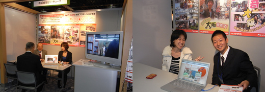 ポスターとデカいテレビはかなり目立ちました。兵庫県海外観光プロモーションビデオの「城崎温泉」、「大阪!我来了」と「ビックリ大阪」を流れながら、美しい、楽しそうな空間を作りました!