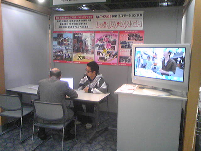 ポスターとデカいテレビはかなり目立ちました。兵庫県海外観光プロモーションビデオの「城崎温泉」、「大阪!我来了」と「ビックリ大阪」を流れながら、美しい、楽しそうな空間を作りました!